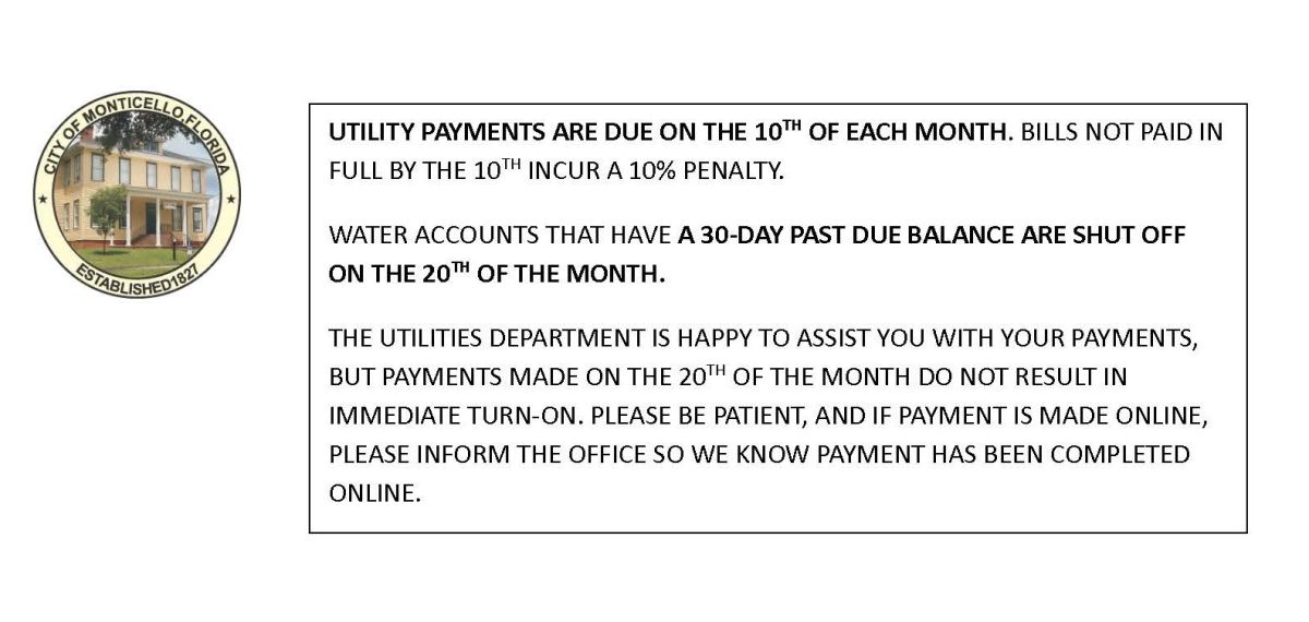 Utility bills are due on or before the 10th of the month. If not paid by the 10th, a 10% penalty will be added to outstanding balances. On the 20th day of the month, customers who have outstanding balances from combined current and prior billings will have water services discontinued, and a fee of $20 will be charged to resume service after payment of all monies due.